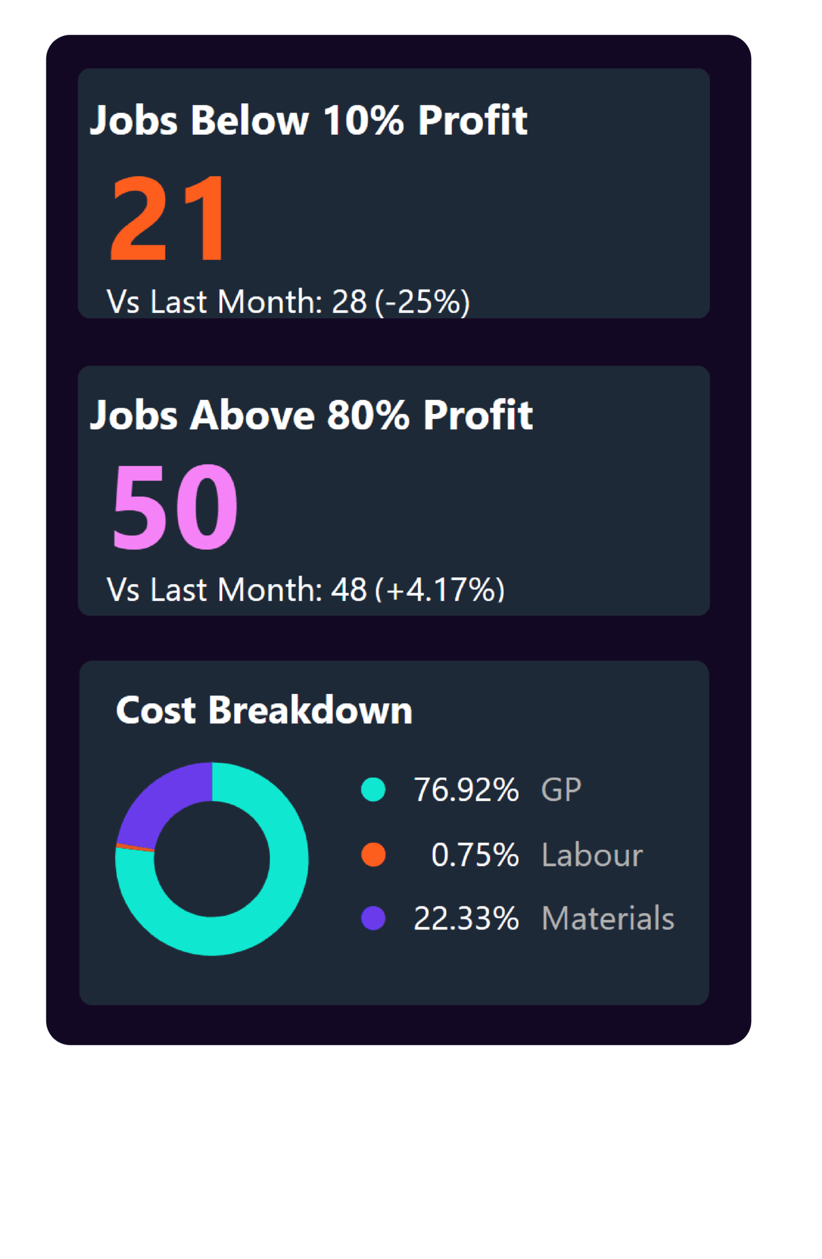 Get the clarity of a BI team and enterprise standard analytics – without the overhead. Book your free 30 minute demo now and we’ll show you examples of the dashboards we’ve created to help construction businesses like yours deliver improved performance and profitability.
